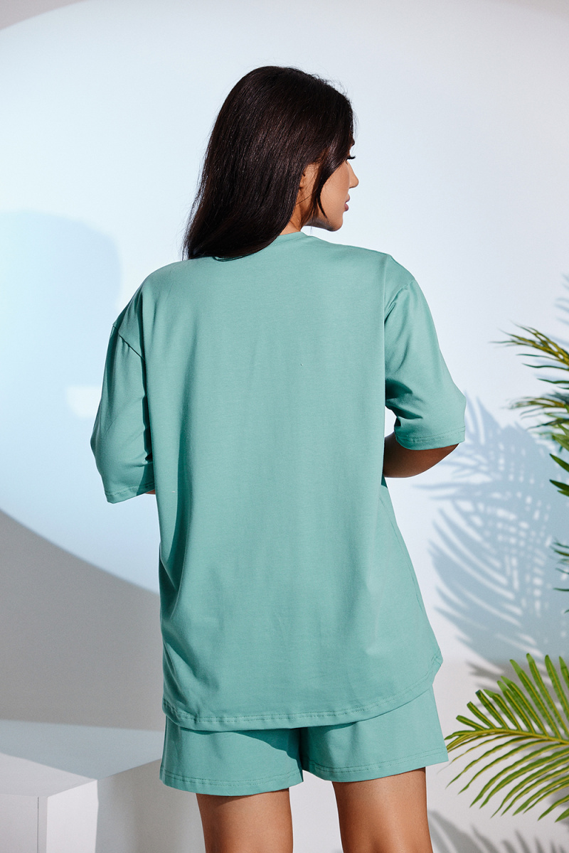 Костюм женский - свободные шорты с футболкой выполнен из кулирки с лайкрой. Спереди на футболке оригинальный принт. Горловина обработана бейкой, края подшиты, пояс на эластичной резинке. Костюм очень удобный и приятный к телу, идеально подойдет как для дома, так и для отдыха и прогулок.