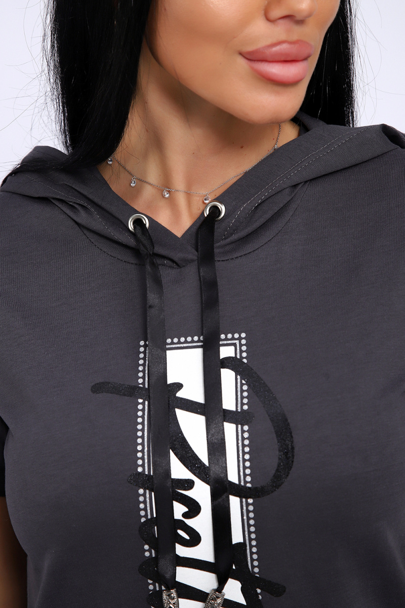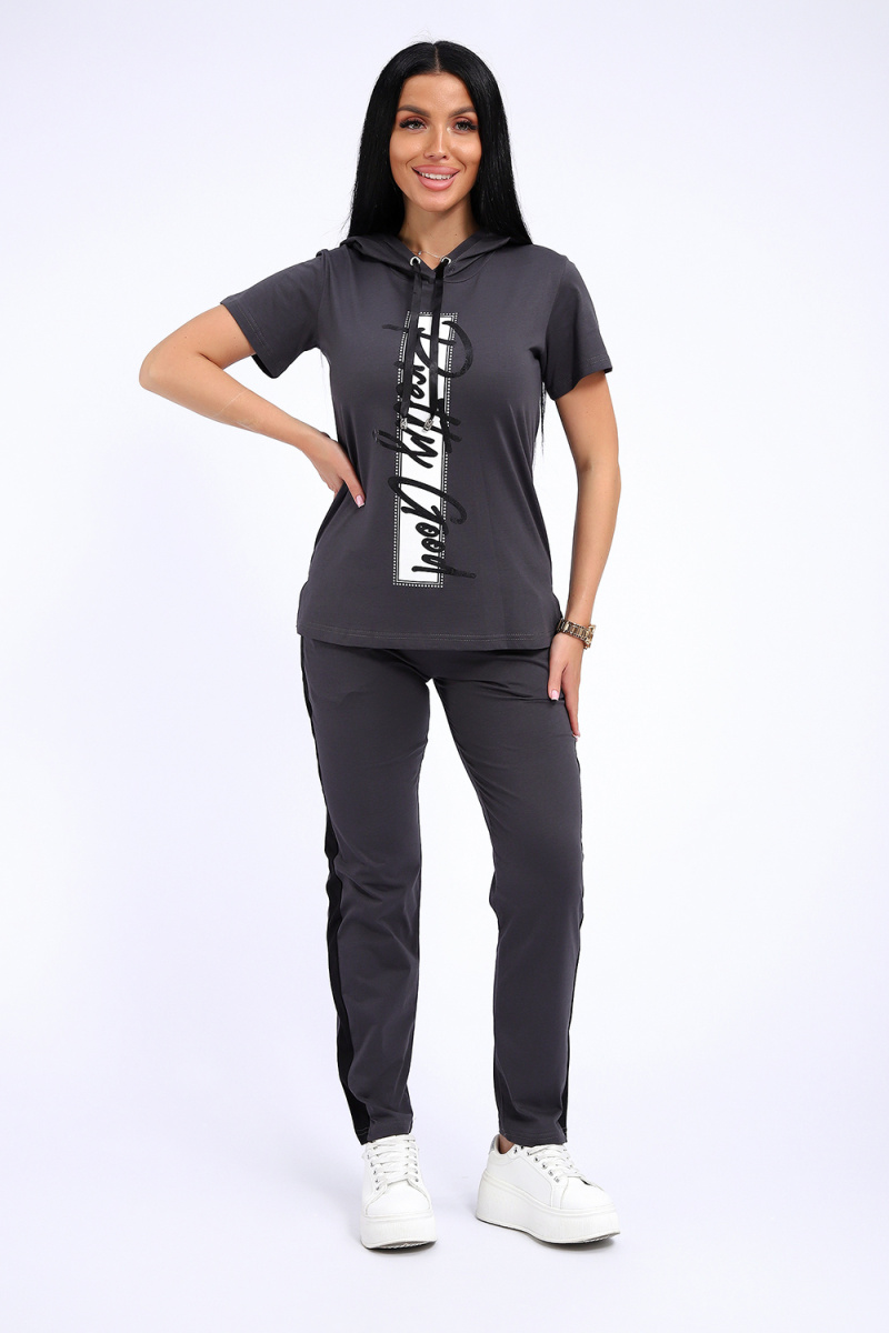 Стильный женский костюм из легкой дышащей ткани. Сшит из мягкого трикотажного полотна высокого качества. Основной изюминкой костюма является яркий принт на полочке кофты, расположенный вертикально и контрастирующий с общим фоном. Кроме того, на кофте имеется капюшон, объем которого регулируется тонкой лентой. Этот универсальный и практичный повседневный костюм в спортивном стиле будет удобным и комфортным во многих ситуациях. Комплект отлично подойдет для спорта, бега или танцев. Брюки свободные с яркими лампасами, двумя боковыми карманами, на широком поясе с резинкой. Каждую вещь вполне можно использовать по отдельности. Комплект отлично подойдет для женщин любого возраста и поможет хозяйке выглядеть стильно, при этом даря чувство комфорта!